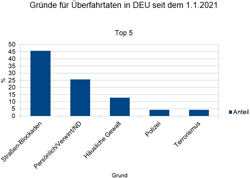 Zu den Hauptgründen für FaW Vorfälle gehören zuerst persönliche Gründe, Verwirrtheit und nicht definierbare Gründe. Dazu zählen Fälle wie z.B. in Magdeburg und Mannheim oder Situationen, in denen eine Bestellung im Restaurant fehlerhaft ausgegeben wurde. Als zweiter Grund ist häusliche Gewalt zu nennen, bei der die jeweiligen Partner oder Ex-Partner mit einem Fahrzeug angegriffen wurden. Und an dritter Stelle steht Terrorismus. Wenn wir jedoch die Anschläge mit Fahrzeugen im Gebiet Israel/Palästina abziehen, fällt Terrorismus als Grund für Überfahrtaten aus den Top 5 und stattdessen erreicht Hasskriminalität die Top 3. In Deutschland sind die Hauptgründe Ärger über Demonstranten; persönliche Gründe, Verwirrtheit oder nicht definierbare Gründe sowie häusliche Gewalt. Wenn wir die Taten gegen die Letzte Generation ausklammern, sind die Hauptgründe persönlich, häusliche Gewalt und Angriffe auf die Polizei.